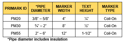 Product Description: Primark Coiled Pipe labels are made from rigid PVC vinyl with 20mil thickness. Manufactured for simple application and for any identification purpose necessary. Labels are suitable for temperatures of -40°F to 160°F. Sizing for coil labels range up to 6″ diameter with included directional arrows on all labels